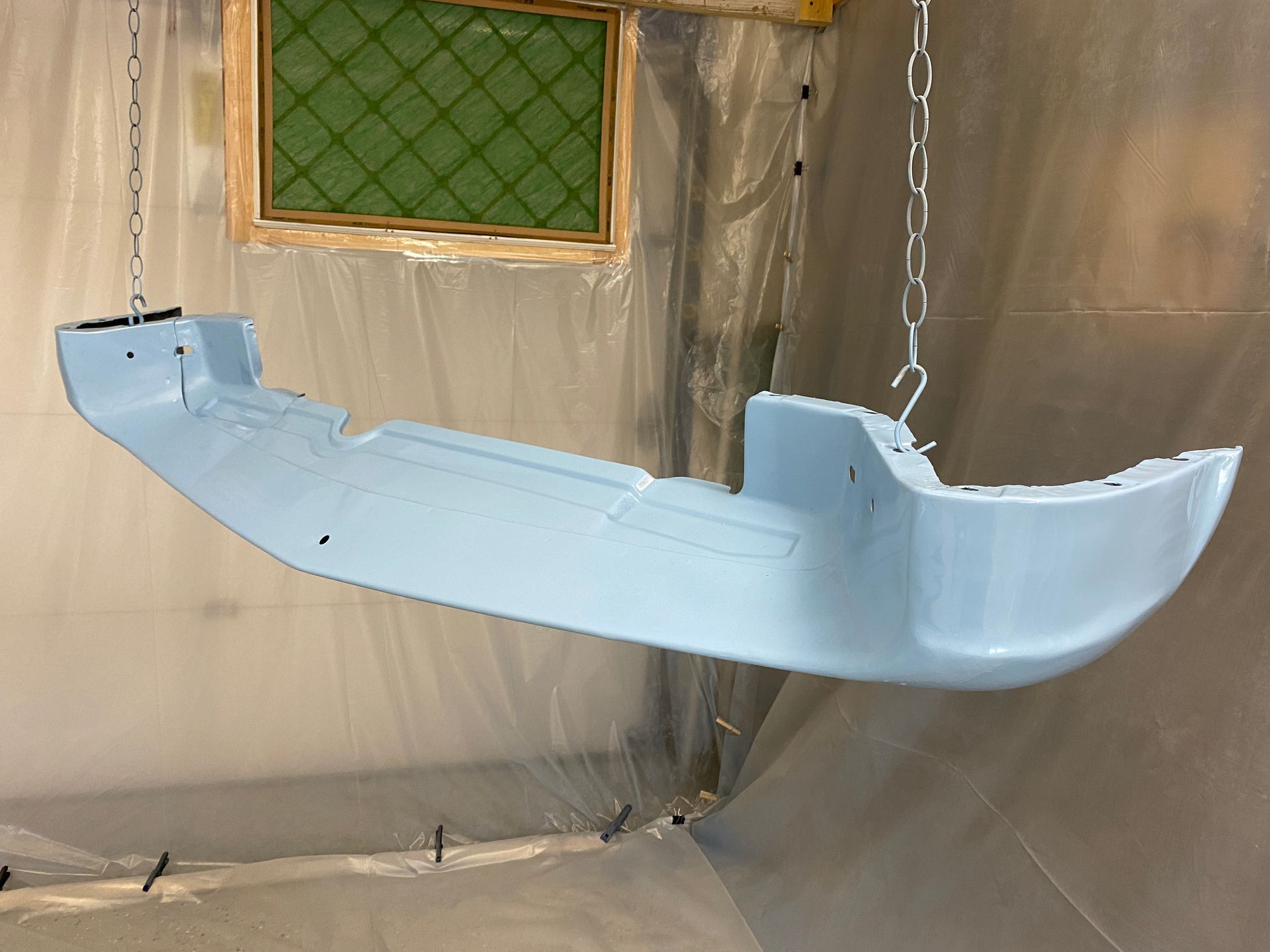 I patched 9 rust spots, using a MIG welder for the first time, and set up a temporary paint booth in my garage. Painting was definitely a learning process, starting with too dry, too wet with runs, and the paint gun sputtering because??? I started to get decent at it by the time the car was painted. I had the chrome pieces re-chromed at a local specialty place. After painting, my wife sewed a new headliner using the old one as a pattern, which we installed together. I re-installed the glass and chrome, installed new rubber for the hood, doors and trunk, new carpet, and had the seats reupholstered. The entire process took around a year and a half.